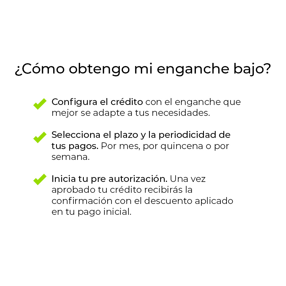 “CAT máximo del 80.19%, calculado con base en pagos puntuales en plazo semanal y aportando el mínimo de enganche. Sujeto a aprobación de crédito.”